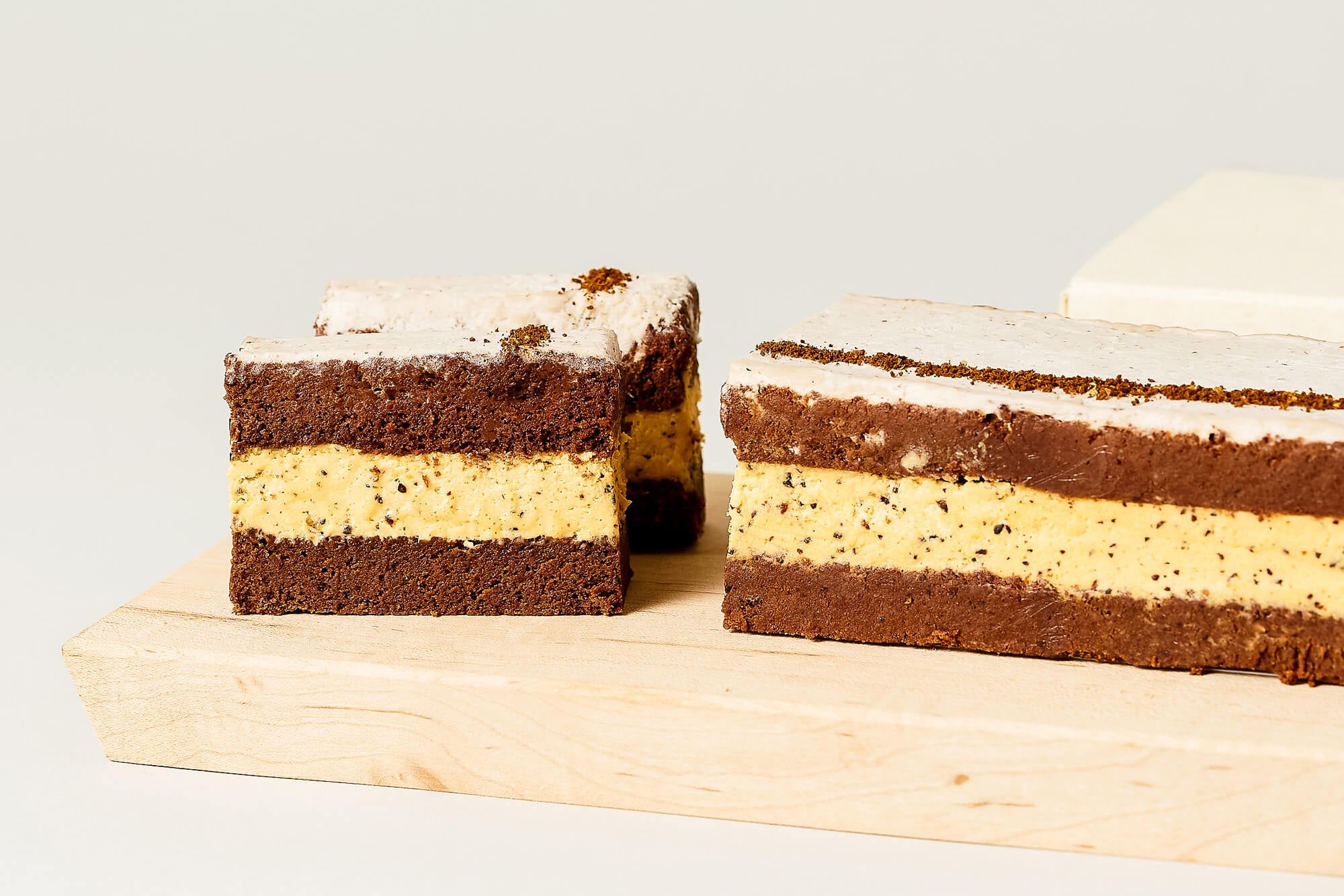中央のクリームに、「REC COFFEE」のエチオピア産コーヒー豆を用いました。ドリップして抽出すると、立体感のある酸に紅茶やミックスベリーのようなフレーバー、そしてほのかに感じるレモングラスの風味を持っています。このコーヒー豆を挽いて粉状にし、中央のカラメルクリームの層にそのまま用いているため、コーヒーの香りをダイレクトに感じていただけます。