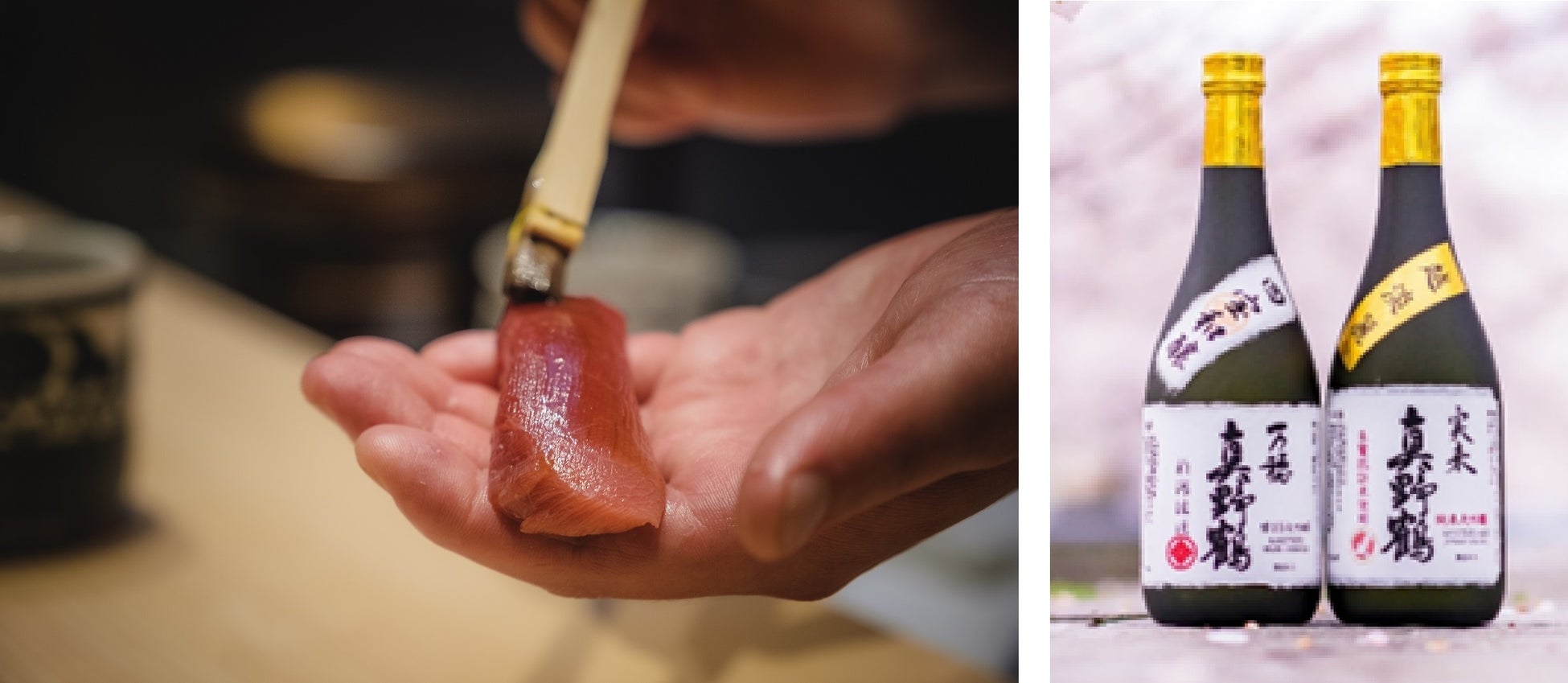 そんな尾畑酒造の代表銘柄である「真野鶴」は、全国新酒鑑評会(日本)、International Wine Challenge(イギリス)、Kura Master(フランス)、Milano Sake Challenge(イタリア)など数々の鑑評会で金メダルを獲得しています。当日は、2022年にKURA MASTERの純米酒部門でプラチナ賞を受賞した「真野鶴毎毎純米」をはじめ、学校蔵の「龍のめぐみ」など計9種類のお酒と、鮨・料理をご用意いたします。鮨と料理には季節の食材をふんだんに使用するほか、新潟の郷土料理もお楽しみいただける予定です。