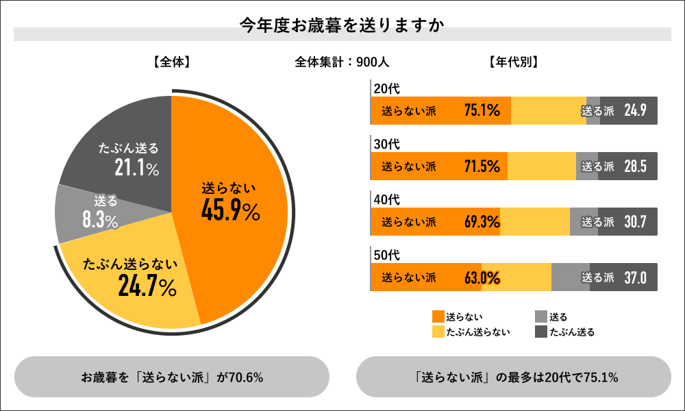 回答者全体の900人に今年度お歳暮を送るかを聞くと「送らない派」が70.6%と過半数を占め、内訳は「送らない」45.9%、「たぶん送らない」24.7%でした。年代別の回答では20代の「送らない派」が75.1%で最多となり、次いで30代が71.5%、40代が69.3%、50代が63.0%の結果になりました