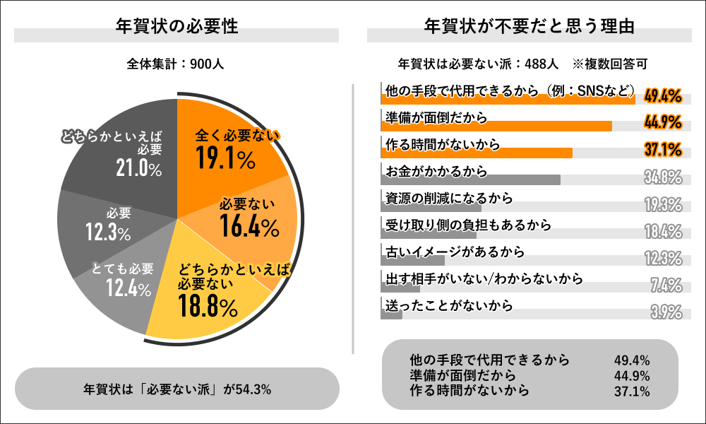 回答者全体の900人に年賀状の必要性を聞くと「必要ない派」が54.3%と過半数を占め、内訳は「全く必要ない」19.1%、「必要ない」16.4%、「どちらかといえば必要ない」18.8%でした。年賀状が不要と回答した488人にその理由を聞くと「他の手段で代用できるから(例:SNSなど)」が49.4%で最多となり、次いで「準備が面倒だから」が44.9%、「作る時間がないから」が37.1%と、上位3つの回答となりました。