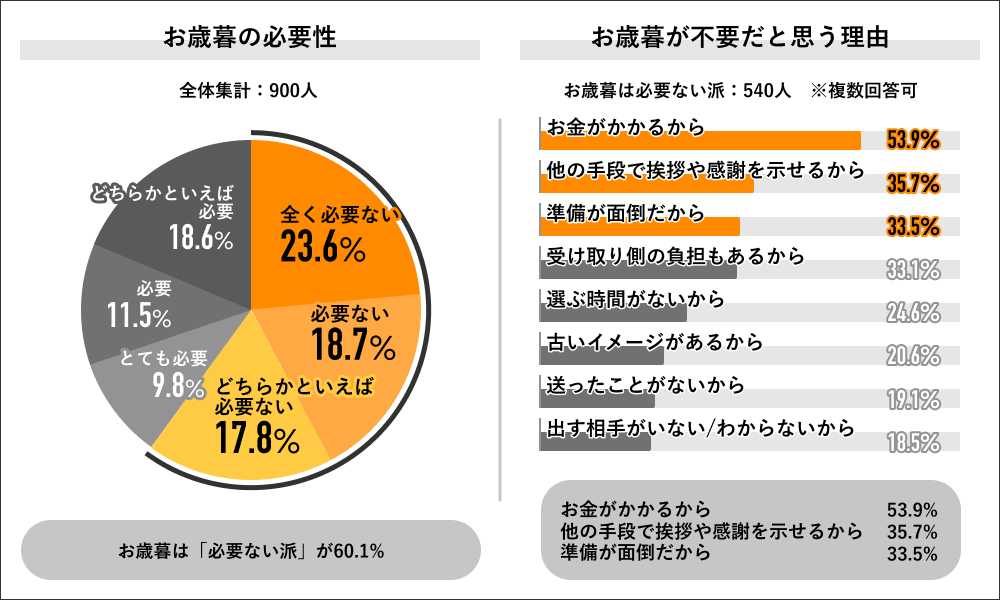回答者全体の900人にお歳暮の必要性を聞くと「必要ない派」が60.1%と過半数を占め、内訳は「全く必要ない」23.6%、「必要ない」18.7%、「どちらかといえば必要ない」17.8%でした。お歳暮が不要と回答した540人にその理由を聞くと「お金がかかるから」が53.9%で最多となり、次いで「他の手段で挨拶や感謝を示せるから」が35.7%、「準備が面倒だから」が33.5%と、上位3つの回答となりました。
