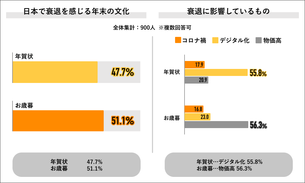 回答者全体の900人に日本で衰退を感じる年末の贈答文化をを聞くと「お歳暮」が51.1%で最多となり、「年賀状」が47.7%でした。同回答者に衰退に影響しているものを聞くと、55.8%が年賀状の衰退には「デジタル化」が、56.3%がお歳暮の衰退には「物価高」が関係していると回答し、文化ごとに衰退意識の背景が異なる結果となりました。