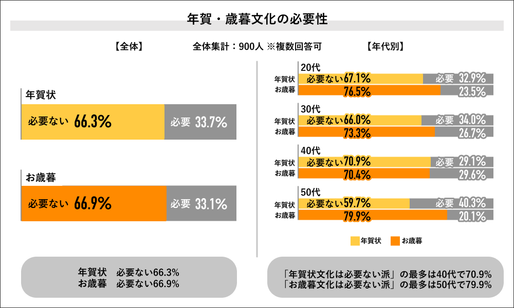 回答者全体の900人に年賀状とお歳暮の各贈答文化の必要性を聞くと「年賀状文化は必要ない派」が66.3%、「お歳暮文化は必要ない派」が66.9%で最多となりました。年代別の回答では40代の年賀状文化は「必要ない派」が70.9%で最多となり、次いで20代が67.1%、30代が66.0%、50代が59.7%の結果になりました。お歳暮文化では50代の「必要ない派」が79.9%で最多となり、次いで20代が76.5%、30代が73.3%、40代が70.4%の結果になりました。