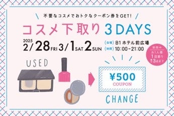 今年も開催決定!不要なコスメで、おトクな500円クーポン券をゲット♪さらにフード&スイーツ店で使えるお買物券200円分ももらえる、おトクな3日間!「コスメ下取り3DAYS」開催