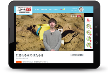 学校・学習塾などを対象とした『スクールTV Professional Edition』は全国の主要科目の教科書内容に対応した小・中学生向けの動画教育サービスです。約1,000本の授業動画を配信し、自ら能動的に学習する「アクティブ・ラーニング」のメソッドを日本で初めて動画内に導入しています。授業動画を視聴中に、動画に連動したドリル(問題)が出題されることにより、勉強が苦手な子どもたちでも飽きずに授業動画を視聴できるように設計されています。