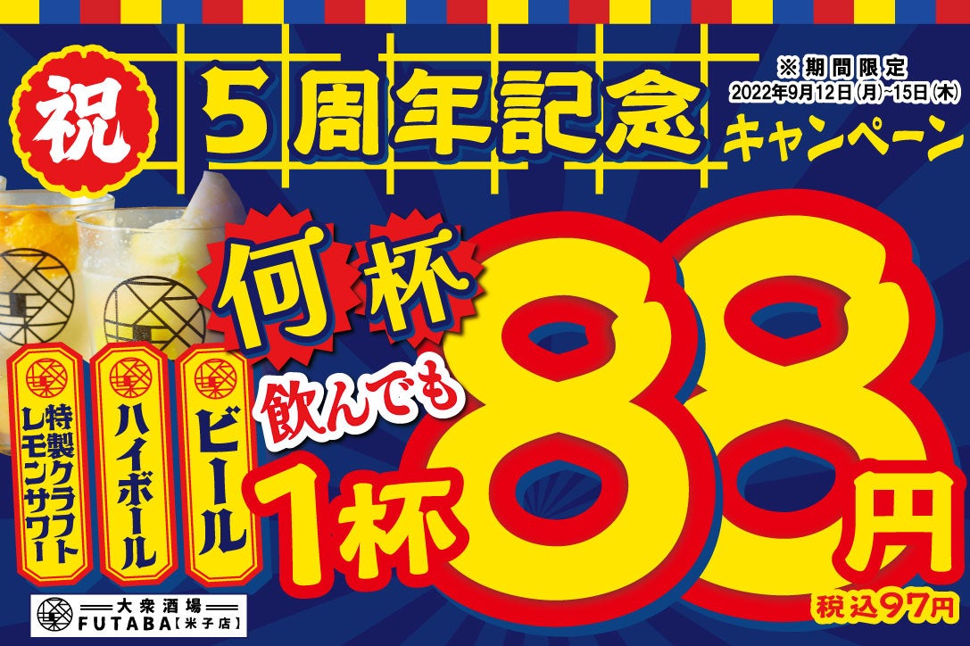 オープン5周年を記念して、ビール、ハイボール、クラフトレモンサワーを何杯飲んでも1杯88円で提供するキャンペーンを期間限定で実施いたします。