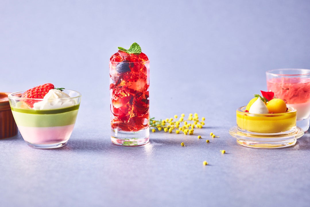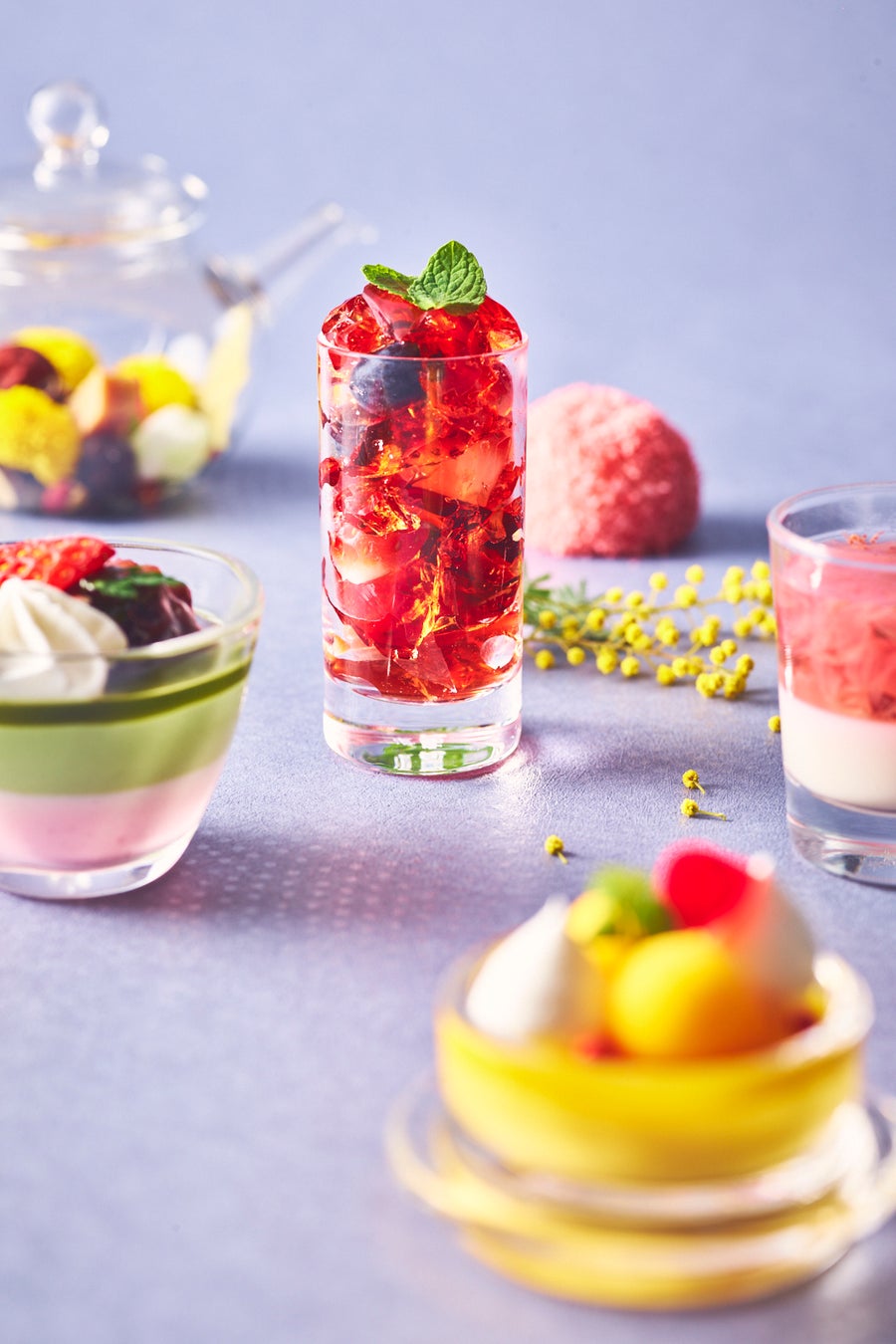 桜餡入りココナッツ団子や、いちごのエッグタルト、抹茶といちごのババロア など、春から新緑の季節を感じていただけるスイーツをはじめ、定番のマンゴープリンはエナジーカラーに、サンザシとミックスベリーのゼリーはまるでジュエリーのような華やかな装いに仕立てました。