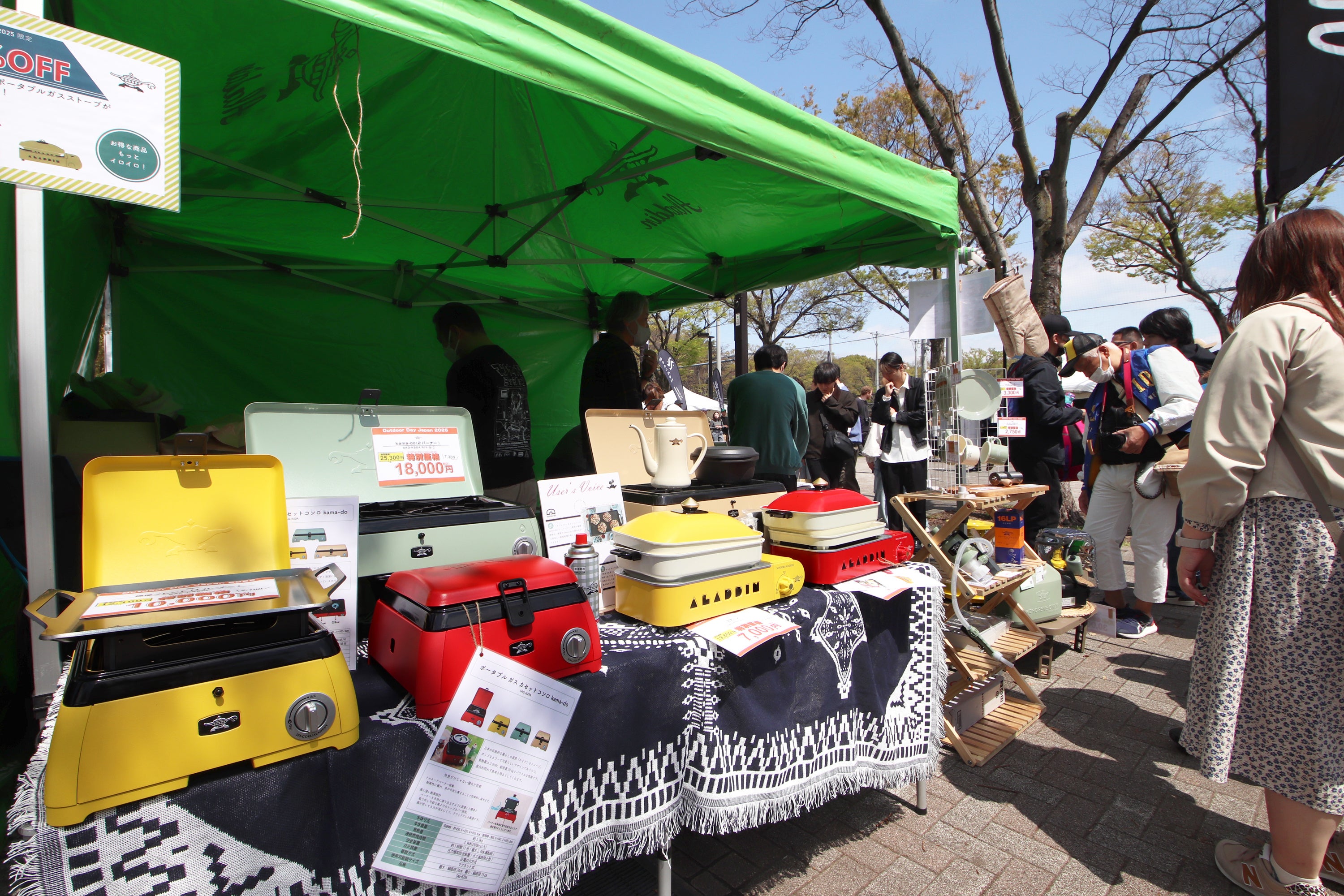 会期中は対象商品をイベント特別価格で販売予定です。実際のサイズ感や使い心地を確かめながら、その場で購入できる貴重な機会として、ぜひアラジンブースへお立ち寄りください。