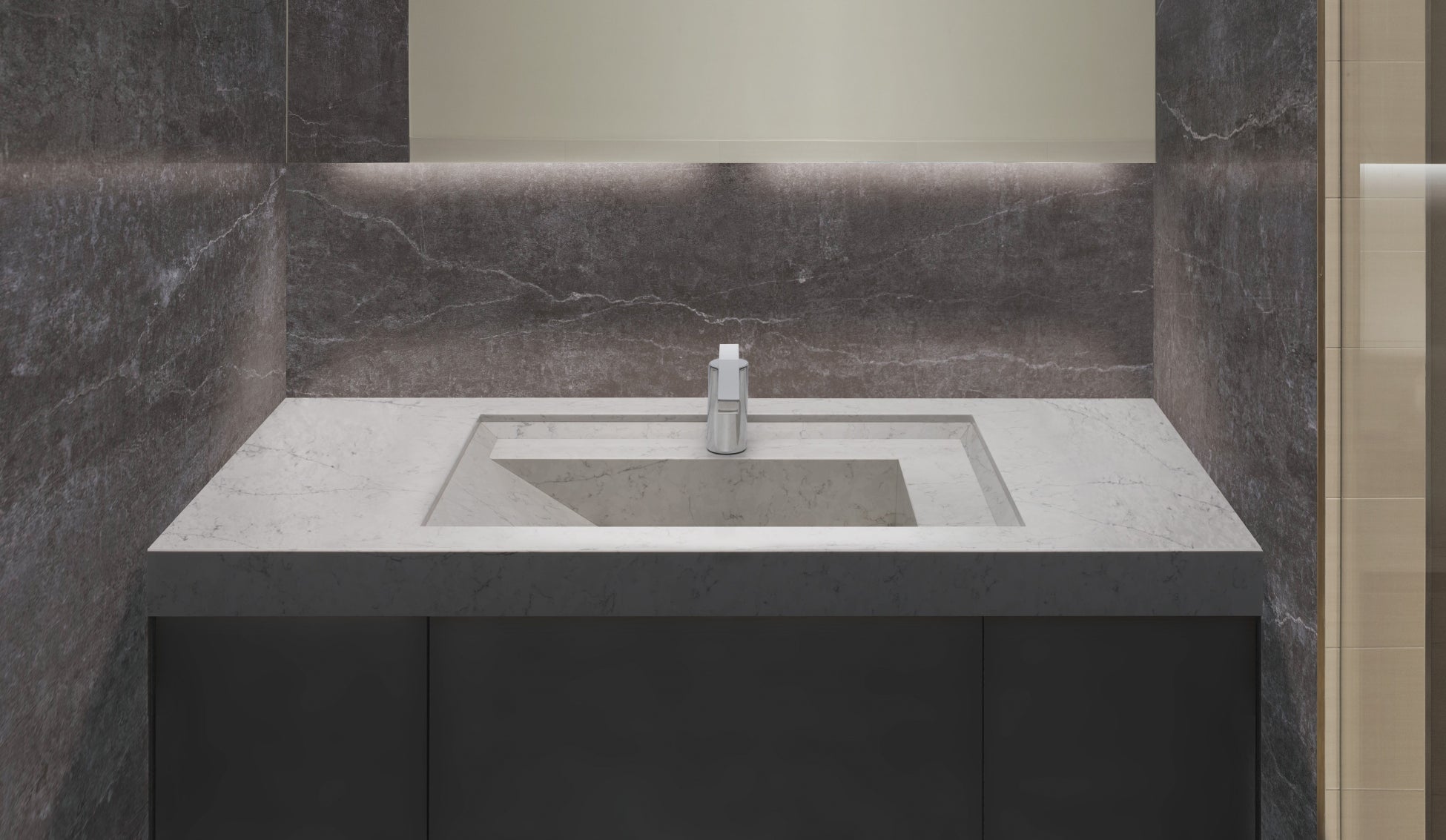 今回加わった「セラフィス」は、複雑な造形デザインをすぐれた加工技術によって実現した、高級感のある洗面カウンターです。ボウル部のアシンメトリーなデザインが特長的で、洗面空間をよりプレミアムな雰囲気に演出します。洗面カウンターと同素材のサイルストーン製排水プレートで排水金具を隠すことで、ボウルのデザインがより一層際立ちます。また、カウンターとボウルは「サイルストーン」全26色に対応しており、空間に合わせた理想のカラーをお選びいただけます。