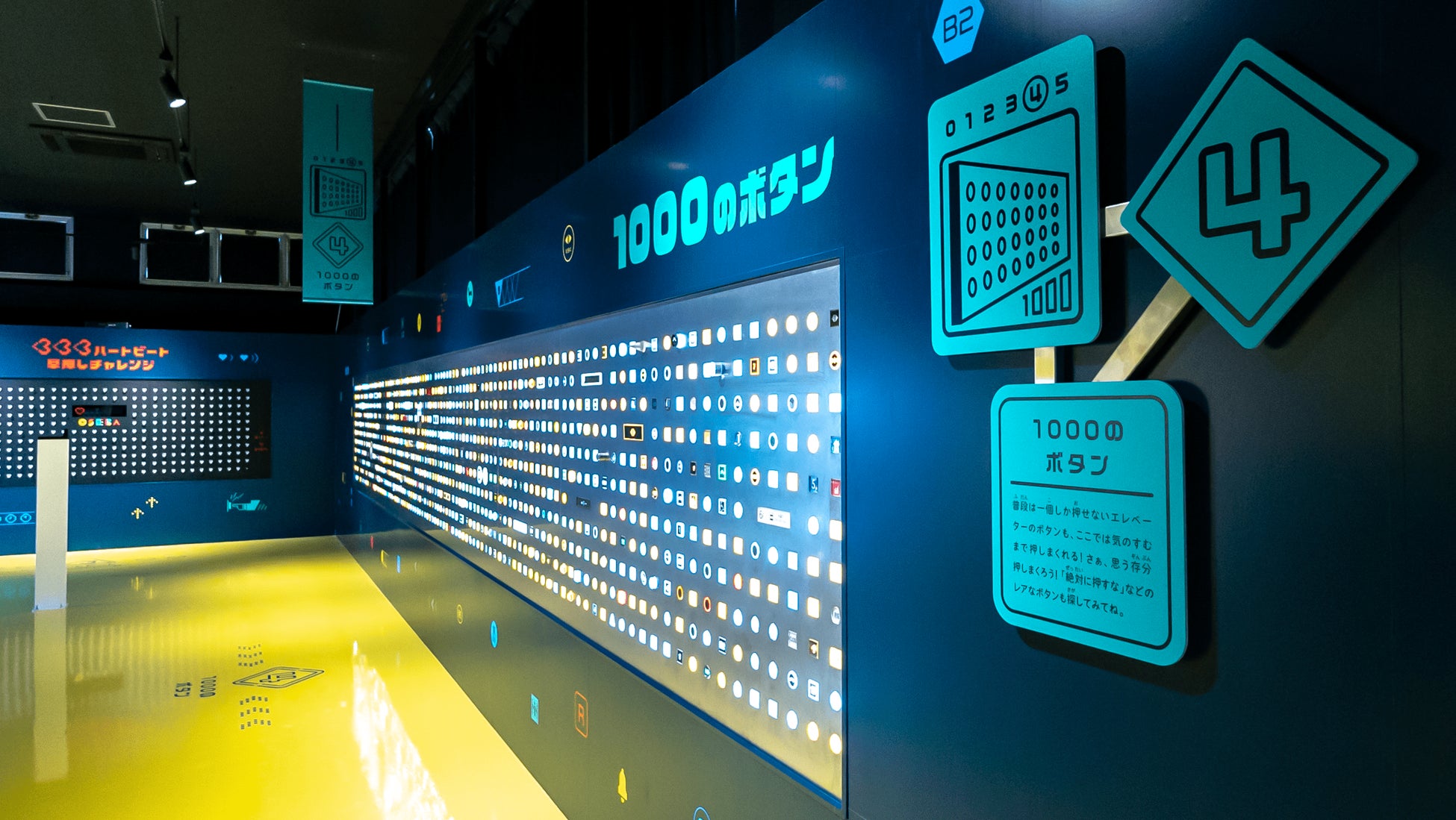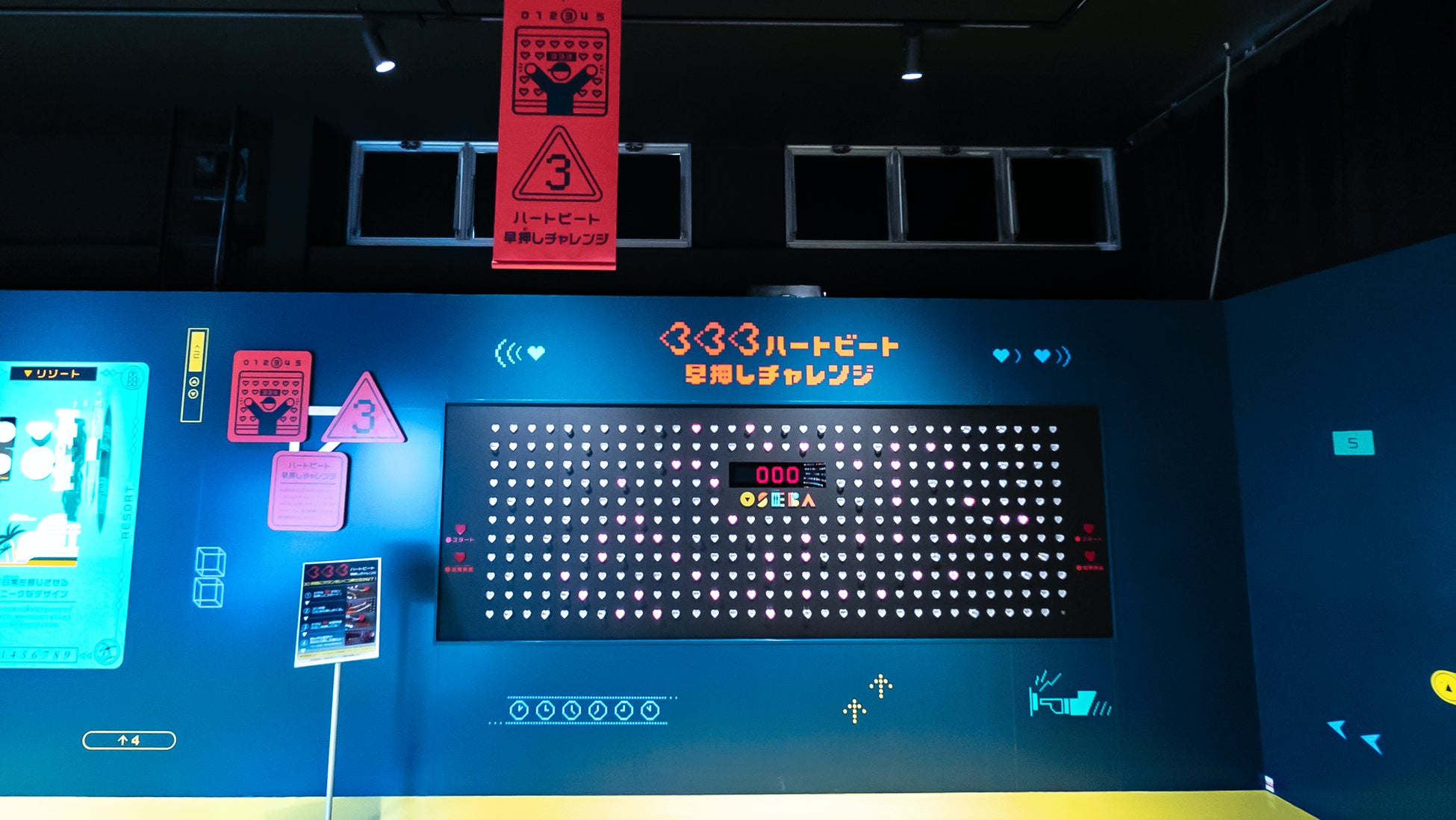 壁にズラリと並んだ333個のハート型のボタン。立ちはだかるボタンたちを、30秒以内にどれだけ押せるかを競います。実は隠しモードがあるという噂も…。