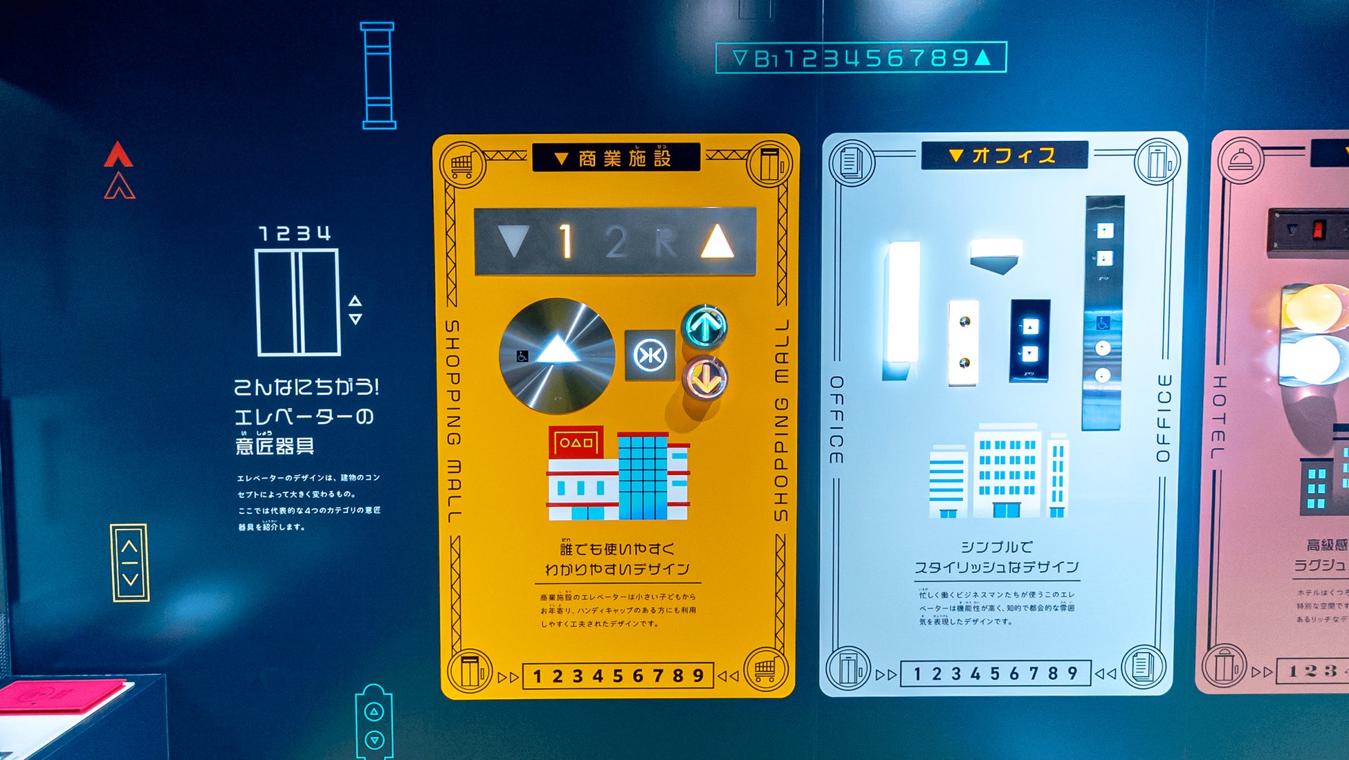 商業施設、オフィス、ホテル、リゾートの4施設で使用されている島田電機の代表的な製品を、ポップなグラフィックとともにご紹介!