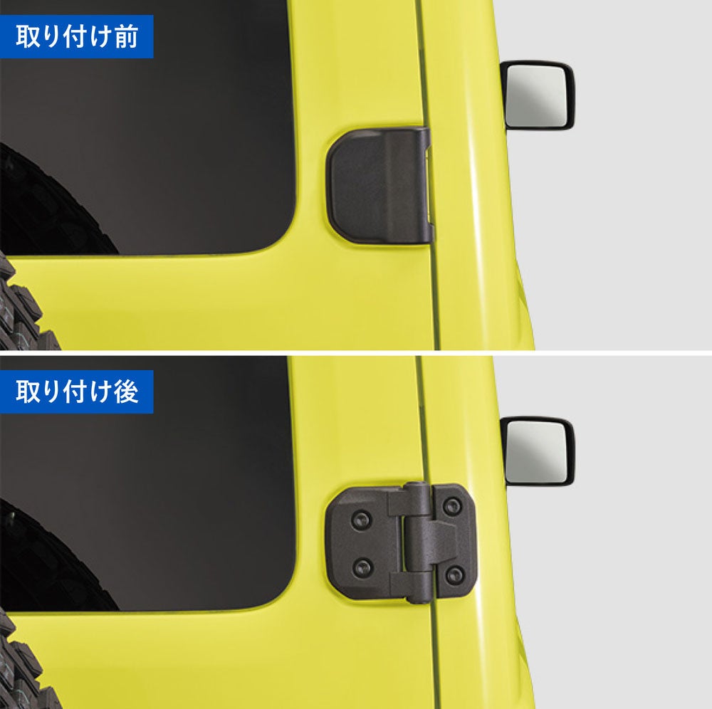 純正はドア側のヒンジカバーのみですが、本製品は車体側に装着するパーツ(ヒンジの羽根)を含めた2ピース構造に。ヒンジデザインを強調することで無骨さを演出しました。一見、上下同設計のパーツに見えますが、車体のフォルムに合わせて厚みを変えるなどし統一感のあるデザインに仕上げました。