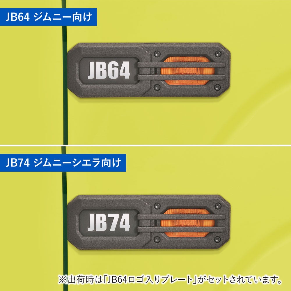 丸みを帯びた純正サイドウインカーの上から貼り付けるだけ。ボリュームのあるパーツで、存在感をアップします。カスタム要素を取り入れ、JB64(ジムニー用)/JB74(ジムニーシエラ用)2種類のロゴプレートも付属。ご自身の車の型式やお好みに応じて交換が可能です。