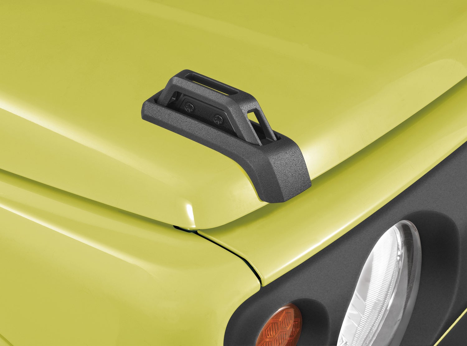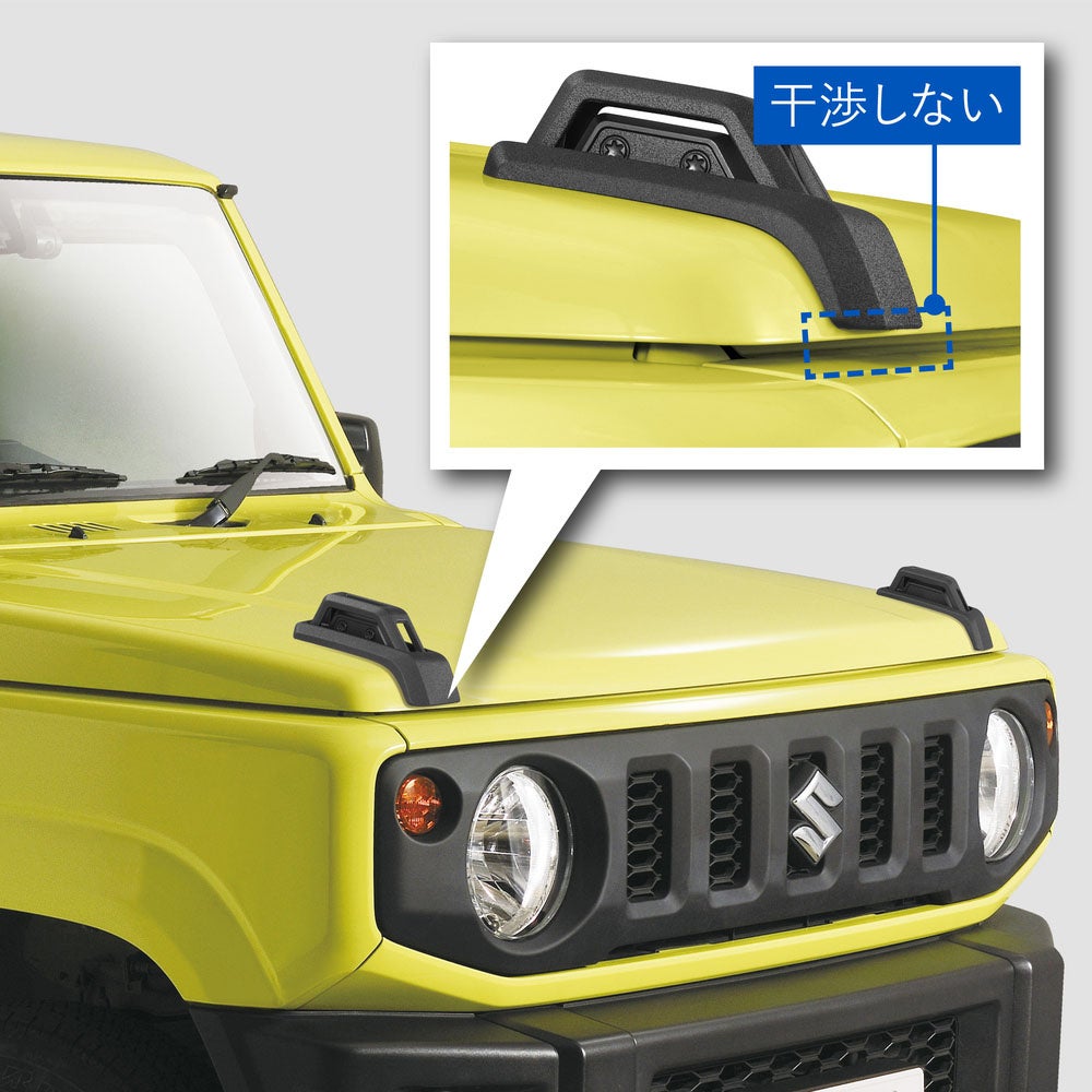 本製品は、北米などで人気のSUV車のボンネットにあるブッシュワイヤーステーをイメージしたアクセサリーで、貼り付けるだけでボンネットをよりワイルドにドレスアップできます。オフロードを走るジムニーをイメージし、タフさを演出。シボの粗さを使い分け、ブラック一色ながらも素材感を効かせました。