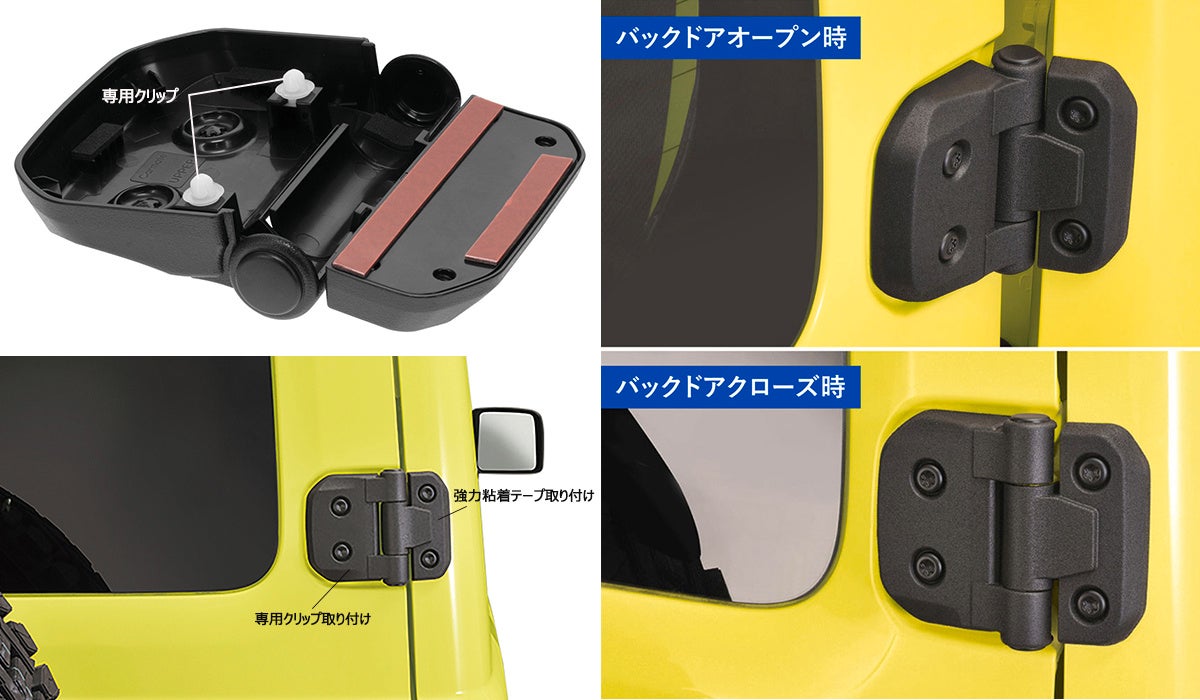 本製品はバックドアの純正ヒンジカバーと交換して装着するドレスアップパーツです。