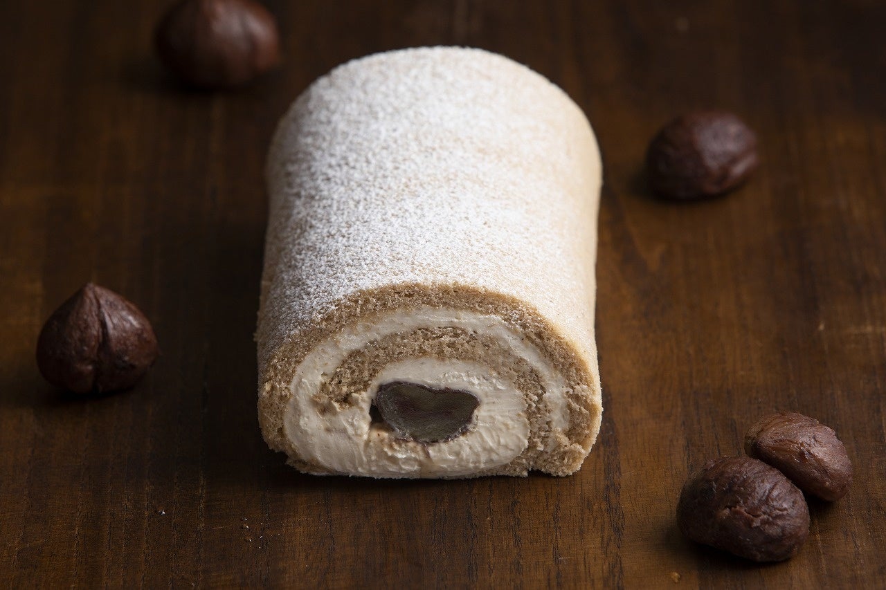 宮崎県美郷町産の和栗を使ったマスカルポーネクリームと栗の渋皮煮を、ふわふわのコーヒー生地でロールしました。