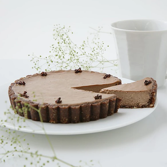 乳製品・卵・小麦粉・動物性食品・白砂糖を一切使用していないチョコタルト。加熱処理をしていないため、素材に含まれるビタミンやミネラルが損なわれづらいんだとか。