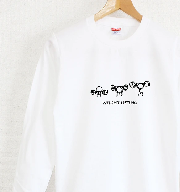 テキスタイルデザイナーが手がける、イラストのロングTシャツ。ダンベルをあげる棒人間が描かれています。ユニークながらもシンプルなデザインです。