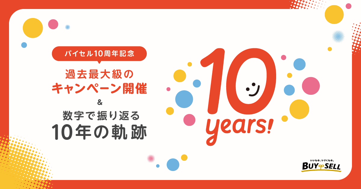 株式会社BuySell Technologies(本社:東京都新宿、代表取締役社長兼CEO:徳重 浩介)は、2025年4月1日に、リユースサービスの提供開始から10周年を迎えます。これまでの感謝の気持ちを込めて、買取・販売の双方で過去最大級のキャンペーンを展開するとともに、この10年間を振り返るグラフィックを公開いたします。