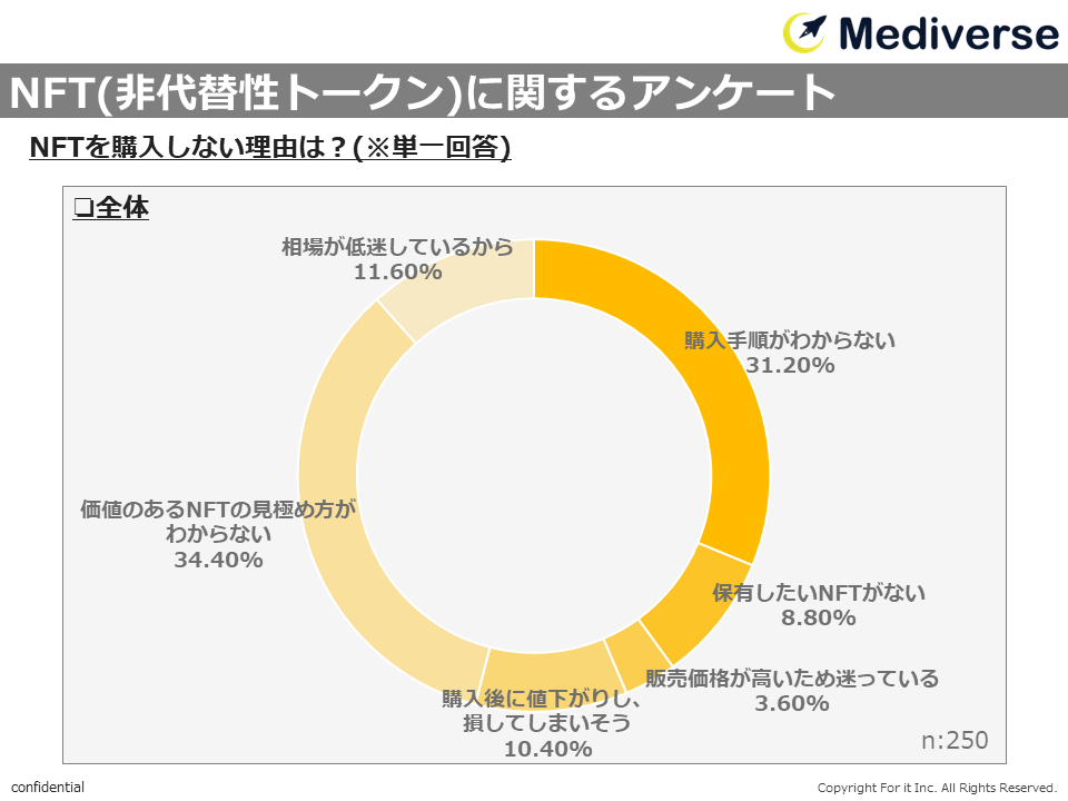 前問で「購入したことがない」と回答した人を対象に購入しない理由を聞いてみると、「価値のあるNFTの見極め方がわからない」と「購入手順がわからない」を合わせて6割強を占める結果となり、NFTに対する見識が乏しいことがネックとなっていることがうかがえる。