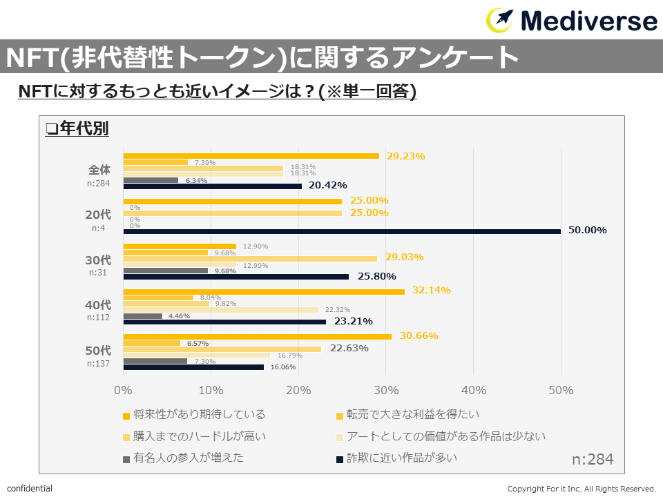 年代別に見ると、30代以外の層は「将来性があり期待している」がもっとも多く、すべての年代において二番手に多かったのは、「詐欺に近い作品が多い」だった。三番手以降は年代によってバラつきが見られたものの、もっとも少なかったのは50代以外の層で一致して「有名人の参入が増えた」であった。