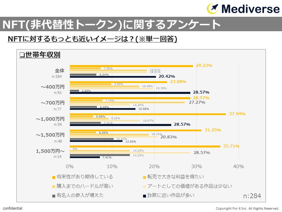 また、世帯年収別に見ると、年収700万円以上の年収層では3割以上が「将来性があり期待している」と回答しており、中でも1,500万円以上の年収層では、どの年収層よりも「詐欺に近い作品が多い」というイメージが少ないという結果が出た。
