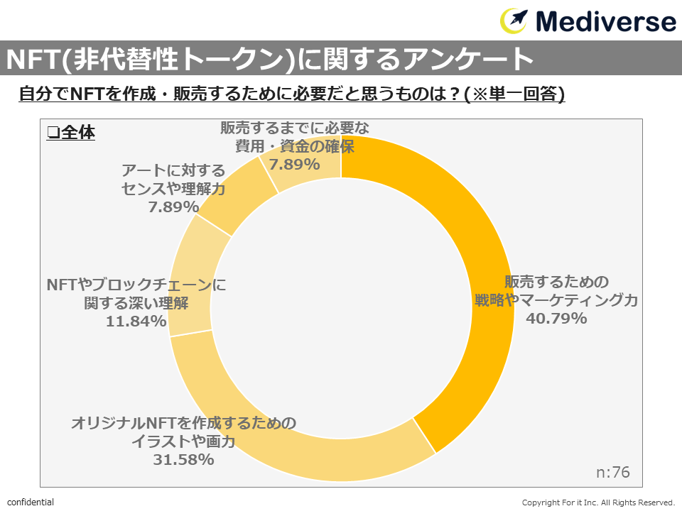 「販売するための戦略やマーケティング力」「オリジナルNFTを作成するためのイラストや画力」「NFTやブロックチェーンに関する深い知識」を合わせると8割強という結果が出ており、NFTを自作販売するためには、NFTに対する知見を深める必要があると考えていることが推測される。