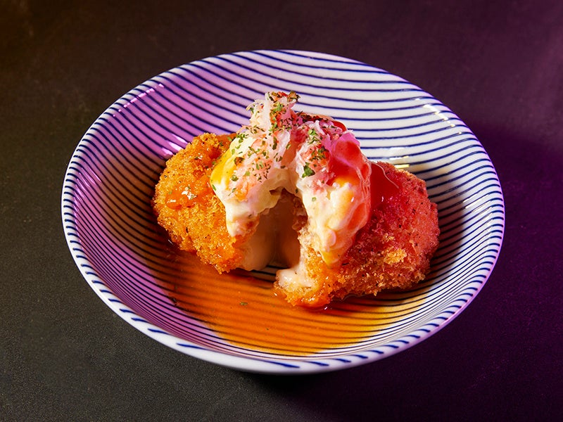 とろとろのカニクリームコロッケにオマール海老ソースをかけ、紅ズワイガニをトッピングしてカニ満載に仕上げました。
