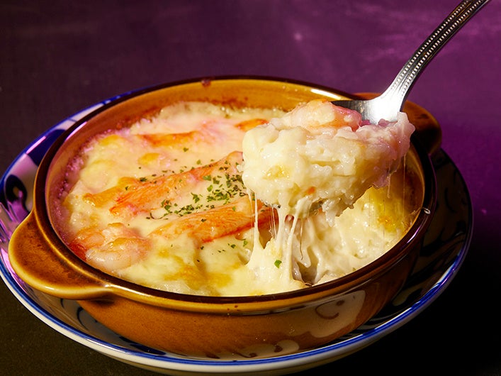 バターライスにホワイトソース、チーズをのせ、ぷりぷりな海老、まるで本物のカニのようカニ風味かまぼこ「ほぼカニ®」をトッピングした、昔の喫茶店の定番シーフードドリアをイメージして仕上げました。
