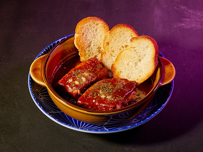信州味噌と赤ワインを使用したデミグラス味噌ソースに、レンゲでほぐせるやわらかな豚バラ肉がごろっと入ったボリューム満点の煮込みです。