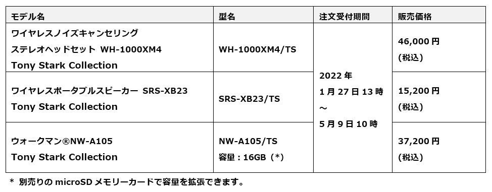 ソニーマーケティング株式会社は、MARVEL(マーベル)の人気キャラクター「トニー・スターク」をモチーフにした特別デザインのワイヤレスヘッドホン、ワイヤレススピーカー、ハイレゾ対応ウォークマン®の注文受付を開始します。受付期間は本日1月27日(木)13時から5月9日(月)10時までとなります。本モデルは受注生産品となっており、お届け時期目安についてはソニーストアの商品購入Webサイトにて表示いたします。