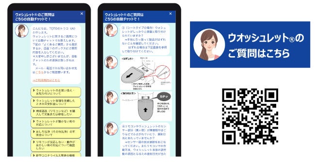 TOTO様のチャットサポートは「https://jp.toto.com/support/」ページより、トウコさんの『ウォシュレット®のご質問はこちらから』アイコンからご利用いただけます。