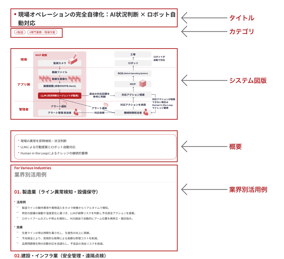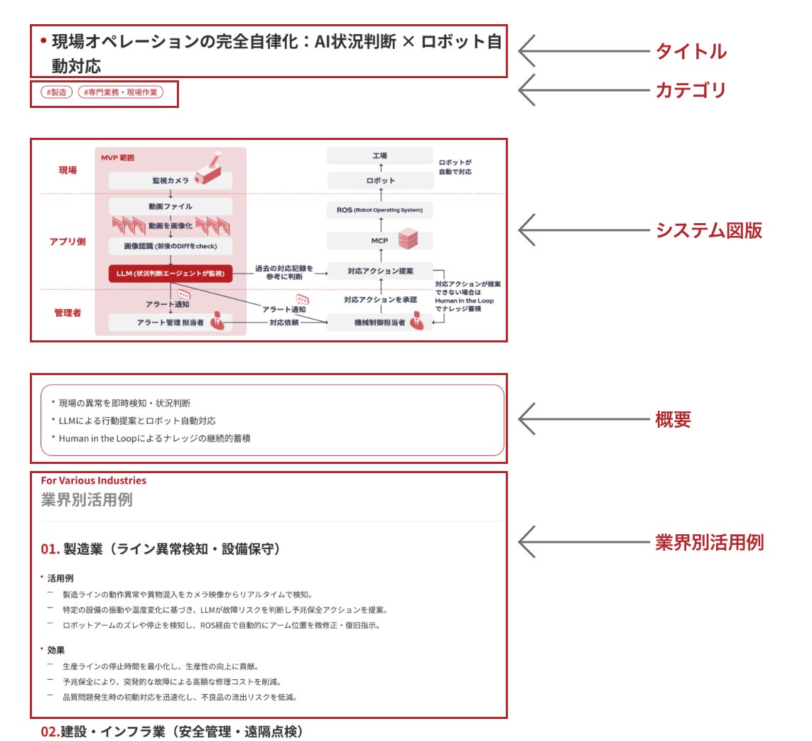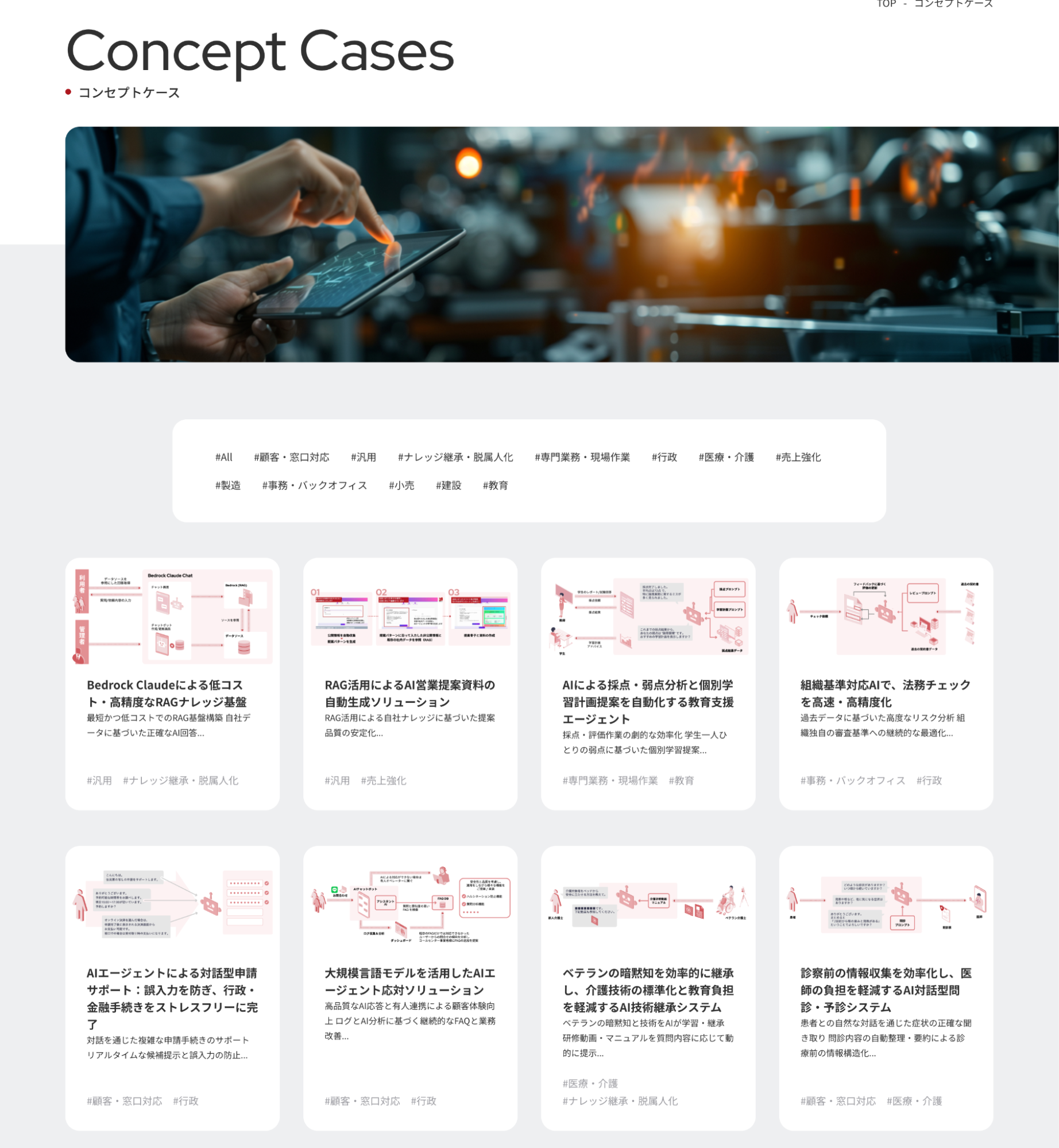 今回のリニューアルでは、AI活用のアイデアをより直感的に把握できるよう、「カタログ形式のコンセプトケース一覧」を新たに整備しました。トップページから全体像を俯瞰でき、関心のあるテーマや業務領域からスムーズに詳細ページへ遷移できる構成としています。