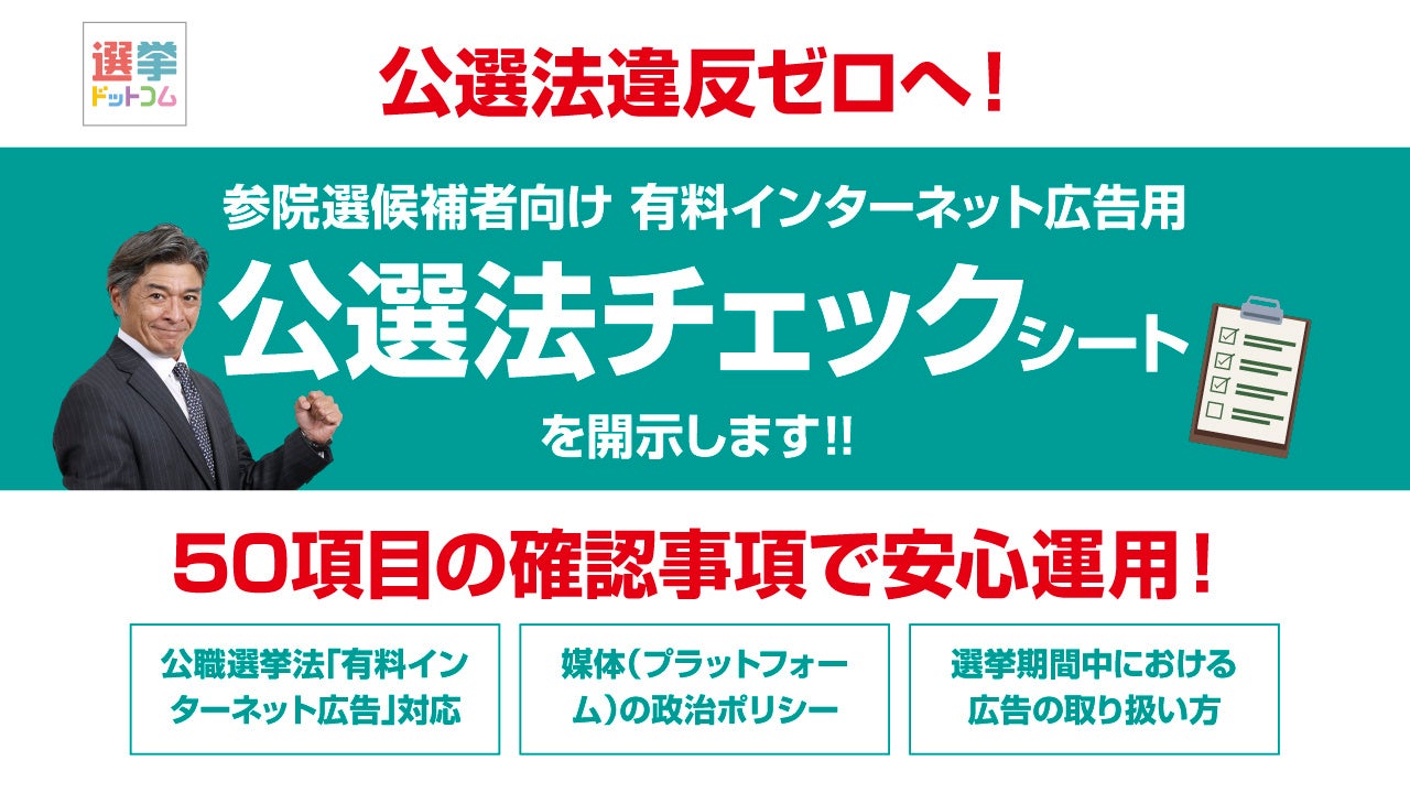 【第27回参議院選挙立候補予定者限定】有料インターネット広告を安心して運用いただくため、「公選法チェックシート」を特別開示!