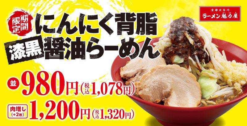 圧倒的ボリューム感。総カロリー1,000kcalオーバーの人気商品が漆黒醤油で新登場!!食べ応え抜群の「にんにく背脂漆黒醤油らーめん」、2024年10月23日(水)~期間限定で販売開始いたします。