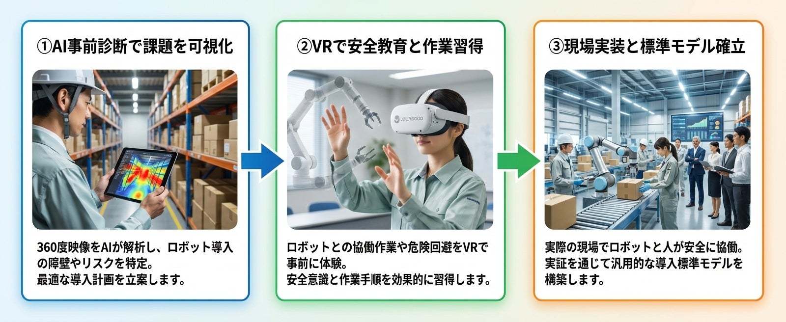 ジョリーグッドは、この「導入の壁」をVRとAIで解消する『JG Robot Ready』を軸に、経済産業省やNEDO等の大型実証事業・補助金を活用した共同プロジェクトを立ち上げます。