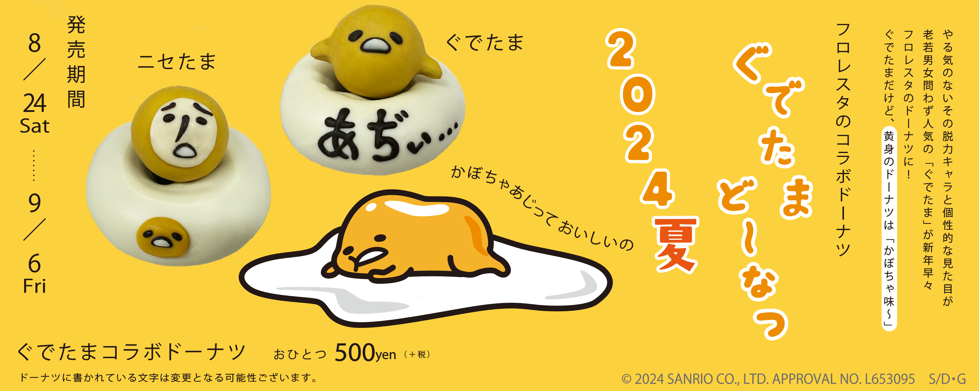 8月24日から9月6日までの期間限定で、「ぐでたま」コラボドーナツを販売いたします。ぐでたまの愛くるしさをそのままドーナツに致しました。