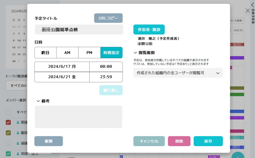 ・遊具等の点検・修繕に関わる現場の予定を「direct Apps」のスケジュールで管理