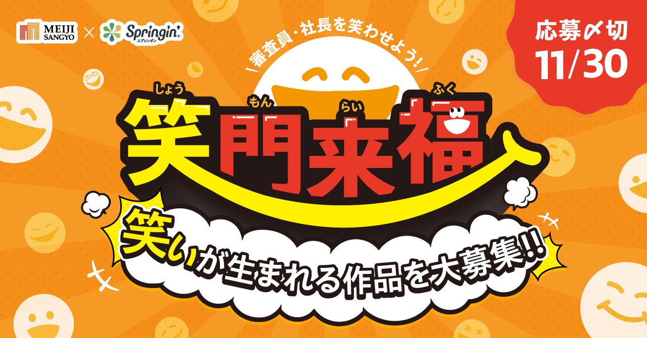 この度、ガスや電気など、住宅関連サービスを通じて暮らしに笑顔を生み出している株式会社明治産業(福岡県福岡市中央区/代表取締役 明永喜年)とともに、2022年10月3日(月)~11月30日(水)の期間にて、「笑門来福(しょうもんらいふく)コンテスト」を開催します。本コンテストでは、暮らしに笑顔を生み出し続ける明治産業にちなみ、誰かを笑わせて幸せになれる楽しい作品を、「スプリンギン」にて募集します。そして、本コンテストの審査員長には明治産業の明永社長が務め、笑いと幸せが生まれる作品を審査していただきます。なお、優秀賞に選ばれた作品には明治産業ならではの「笑い」と「幸せ」が詰まった賞品を贈呈予定です。