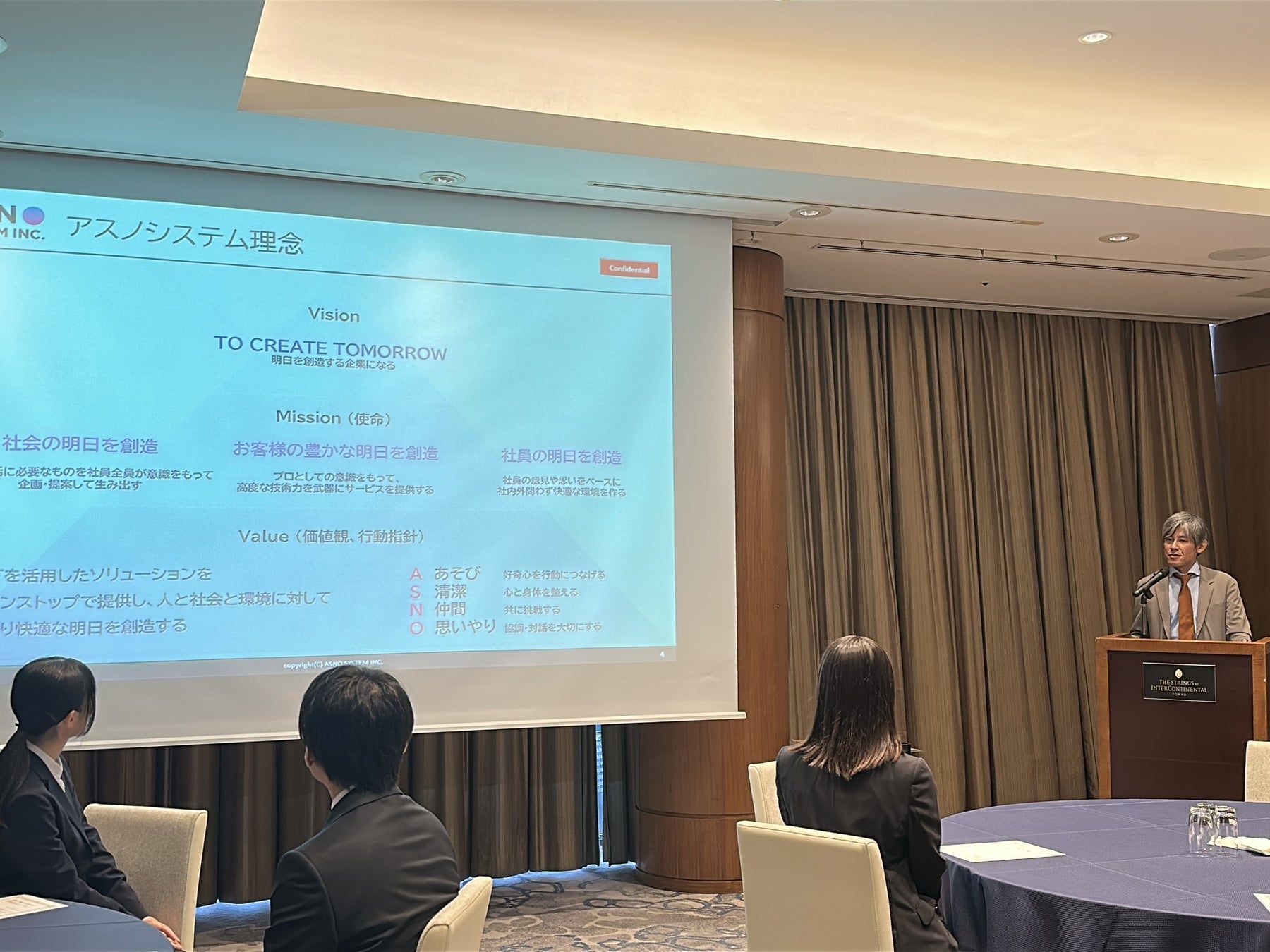 「私たちはITの技術力を使って仕事をしています。しかしながら、やっていることは、あくまでも人と人との仕事です。お客様や、先輩や上司など、どのような想いで話をされているのか、常に相手のことを想いながら、日々の仕事に取り組んでほしいと思っています。アスノシステムは、ビジョン、ミッション、バリューがあり、全社員が共通認識を持っているからこそ、変化の激しいIT業界の中で、迷わずに進むことができています。皆さんが入社する4月、アスノシステムは、新たなステージに挑戦していきます。皆さんの新しい発想と行動力が、必ず挑戦の大きな力になります。ぜひ一緒に悩んで、一緒に笑って、一緒に未来を作っていきたいと思います。皆さんとともに明日を創造できる日を、楽しみにしています。」