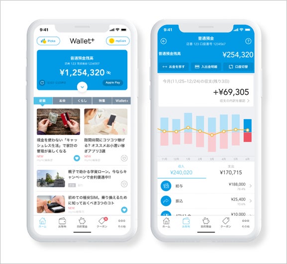 “Wallet+(ウォレットプラス)”は、提携銀行の口座を登録して利用できるスマホ専用アプリです。阿波銀行・沖縄銀行・北日本銀行・熊本銀行・佐賀銀行・十六銀行・十八親和銀行・南都銀行・八十二銀行・広島銀行・福岡銀行・山梨中央銀行の口座を登録することで、口座残高や収支を見える化したり、目的ごとに貯蓄する目的預金などの金融機能をご利用いただけます。そのほか、お金やくらしにまつわる記事やクーポン、ポイントサービスなどの非金融機能を提供しています。