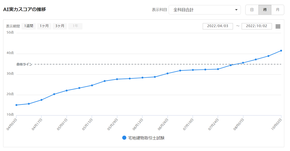 今回実装する新機能「AI実力スコアの推移」は日々の学習によって上昇するAI実力スコアが自動的に集計され、わかりやすいグラフで表示されます。全科目合計の推移と合格ラインを確認できるほか、科目ごとに推移を確認したり、日ごと・週ごと・月ごとの細かい単位での推移を確認することが可能です。