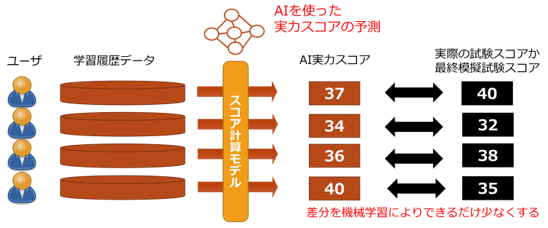 このAI実力スコア計算ロジックの計算では、AI(機械学習)が利用されており、スタディングの受講者の学習履歴データから、AI実力スコアを予測するモデルを実装しています。仕組みとしては、これまでの受講者の学習履歴データと、受講者から入手した実際の試験もしくは模擬試験のスコア(以下「実際のスコア」)をもとに、AIが予測したAI実力スコアと実際のスコアの差分を、機械学習のアルゴリズムによって最小化していきます。数多くのユーザのデータを収集しつつ機械学習で最適化をかけることで、スコア計算モデルが最適化され、AI実力スコアが実際のスコアに近づくのです。