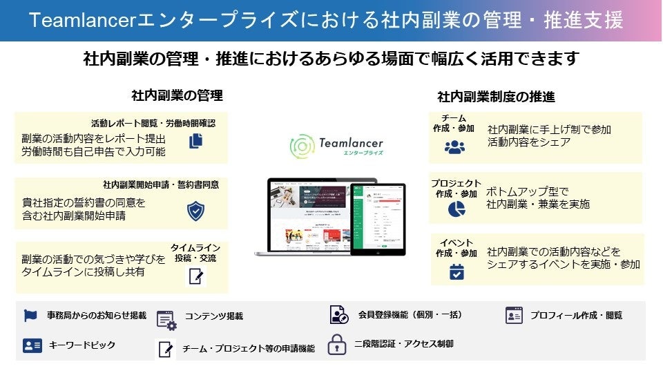 エンファクトリーは、同社に対して、社内副業制度の募集・応募・活動の投稿のためのプラットフォームとして「Temalancerエンタープライズ」の導入と、制度の活性化・定着のための説明会やワークショップの運用支援を開始いたします。