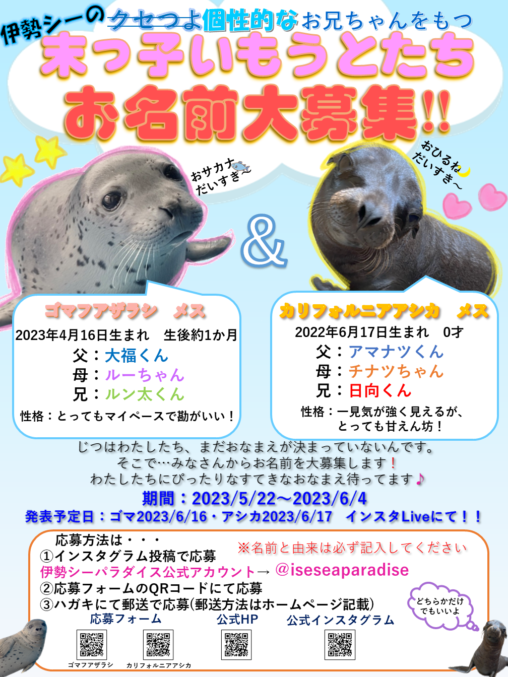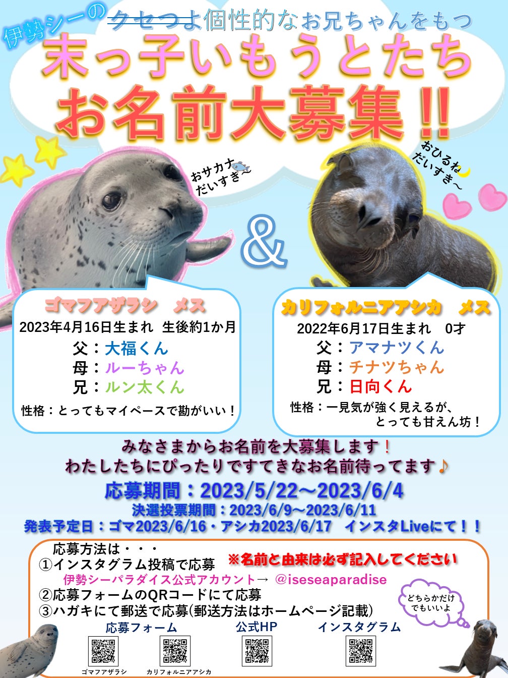 【大大大募集!】伊勢シーパラダイスで誕生した「カリフォルニアアシカ」と「ゴマフアザラシ」の末っ子妹ペアのお名前を募集します!!