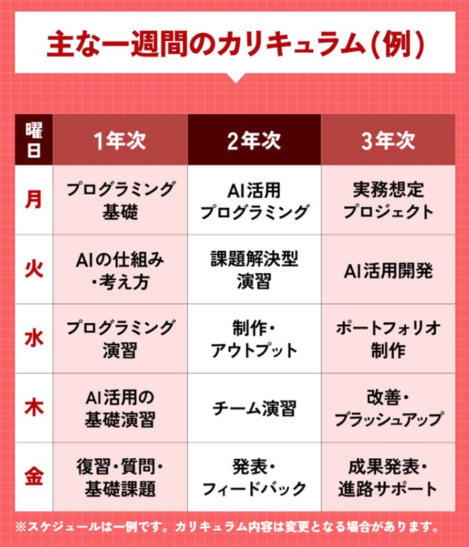 AIプログラミングカレッジは、プログラミングの基礎を確かな土台とし、AIを活用しながら設計・実装を行う力を養う3年制・全日制のプログラミングスクールです。