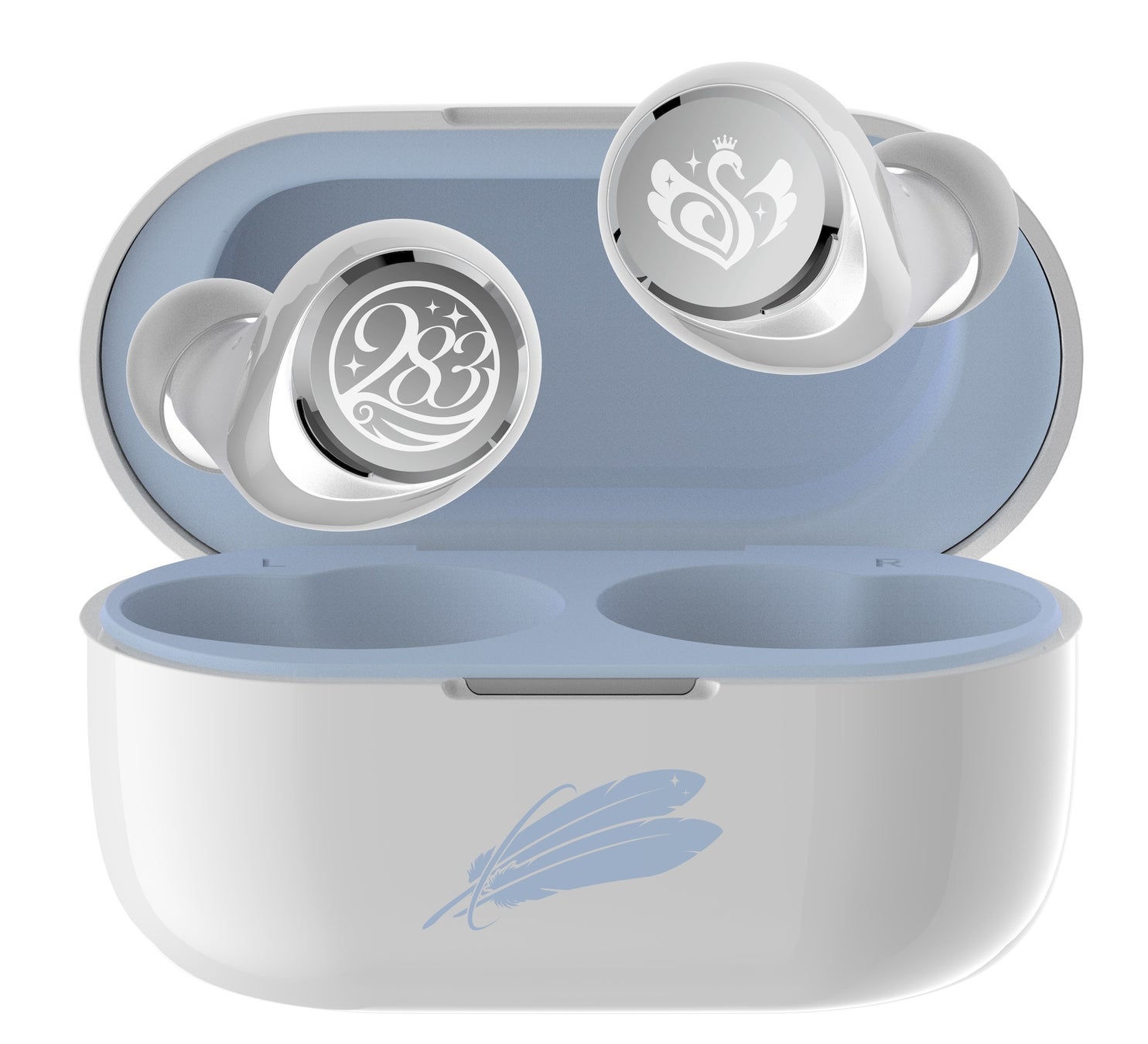 淡く柔らかいイメージの「トワイライト」モデルと、激しくロックなイメージの「ナイトフォール」モデル。チャージングケースのワンポイントには、アイドルマスター シャイニーカラーズを象徴する”羽根”を、イヤホン本体にはスワンマークと283プロダクションのロゴをあしらいました。普段使いしやすいカラーリングと、こだわりの塗装により高級感を演出。デザインと作品コンセプトの表現を両立させた仕様です。