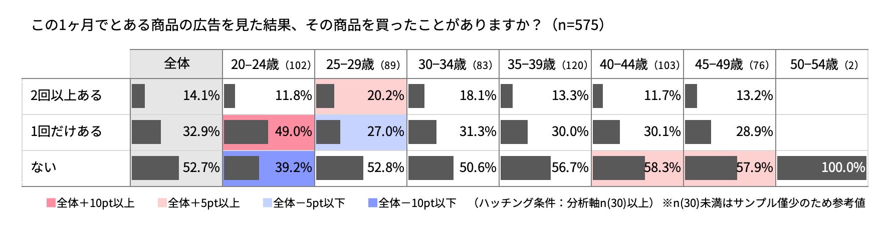 購買経験に関するアンケートの結果、広告を見て特定の商品・サービスを1回、または2回以上購入したことがあると答えた回答者は20代がもっとも多く、20〜24歳では1回だけ買ったことがあると回答した割合が同年代の回答の約半数を占め、25歳〜29歳では2回以上あると回答した割合がアンケート回答者全体でもっとも高く20%を超えました。