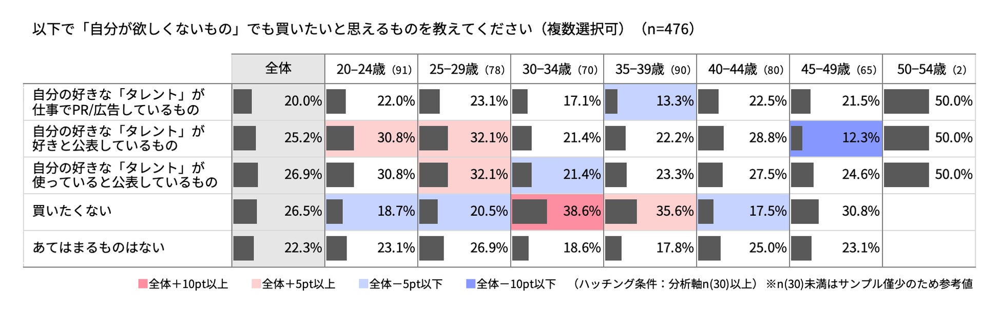 また、20代の回答者の中では、自身が欲しくないと感じているものでも、自分が好きなタレントが「好きだ」と公表しているものや、使っていると公表しているものについては高い購買意向を示しました。