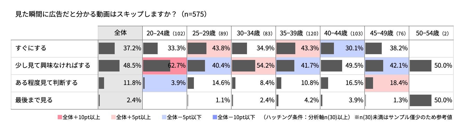 CM動画の消費に関する傾向では、すぐに広告とわかる動画について、全世代でスキップする傾向が高いことがわかりました。20代、特に20〜24歳ではその傾向が強く、少し見たのちに興味がなければスキップすると回答した割合が約半数となりました。